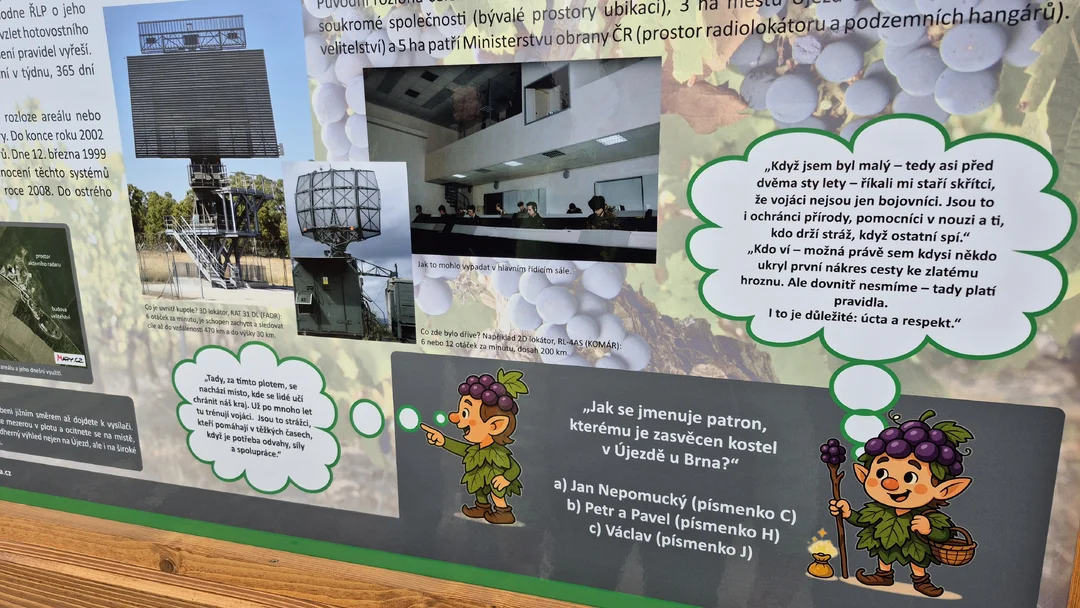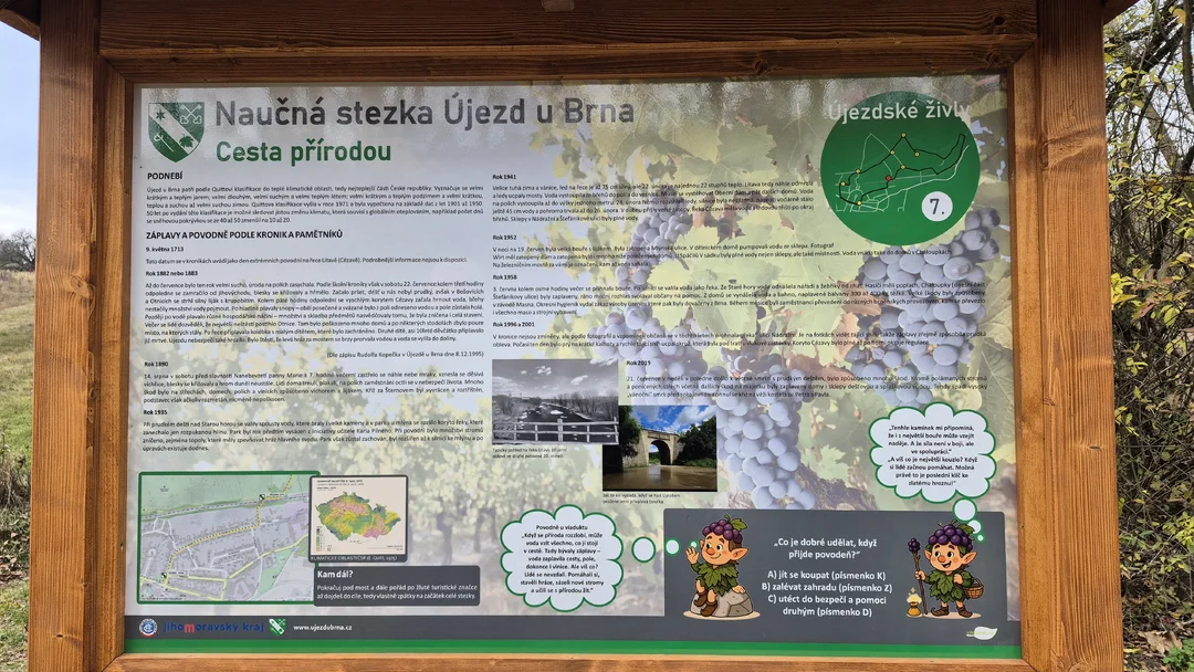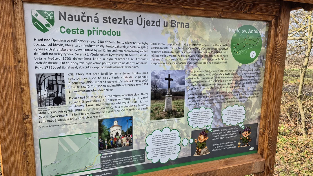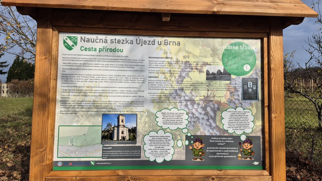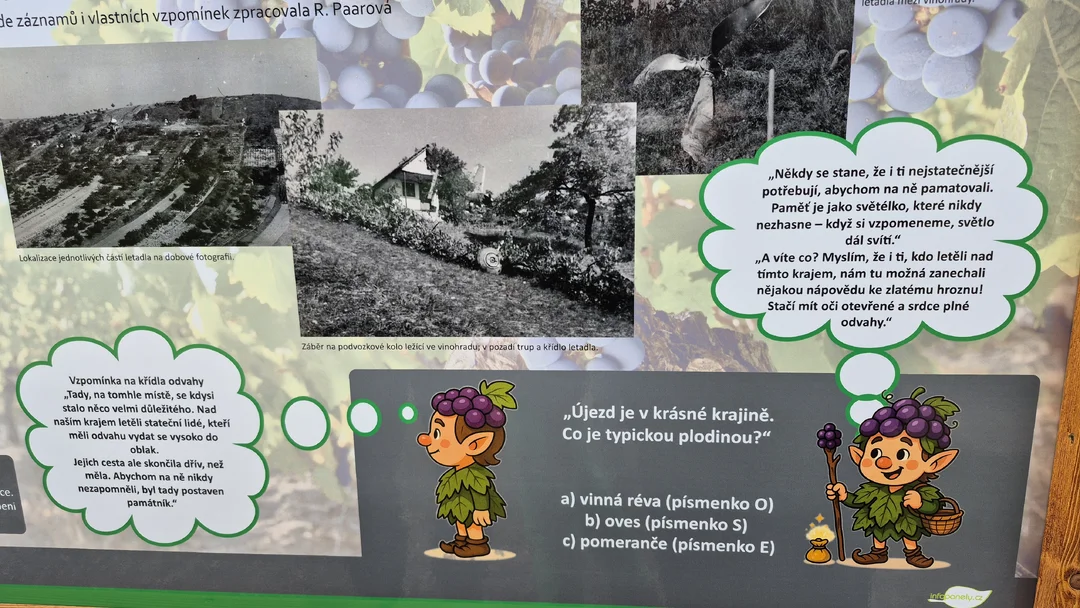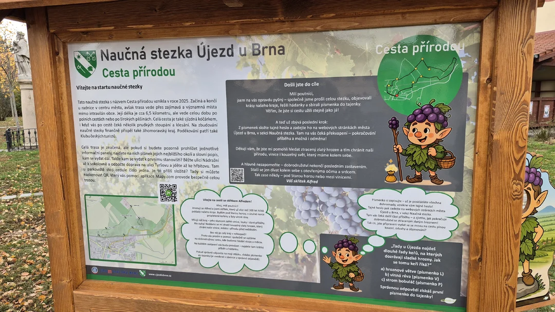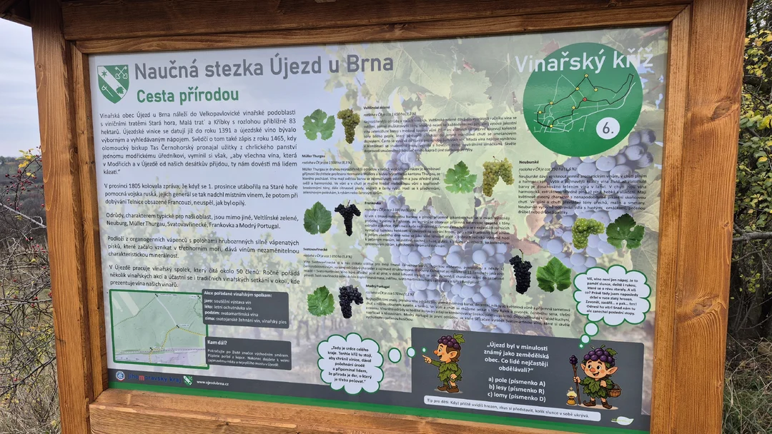 První část stezky, kterou pro vás navštívila a prošla cestovatelka Mili Bednaříková, vede po zelené turistické značce, druhá pak po žluté. Na přibližně 6,5 kilometrech návštěvníci narazí na informační tabule, jež přibližují místní historii či pěstování vinné révy. Během procházky můžete řešit také hádanky od skřítka Alfréda, který vás stezkou provází. Za vyluštění tajenky lze získat odměnu.